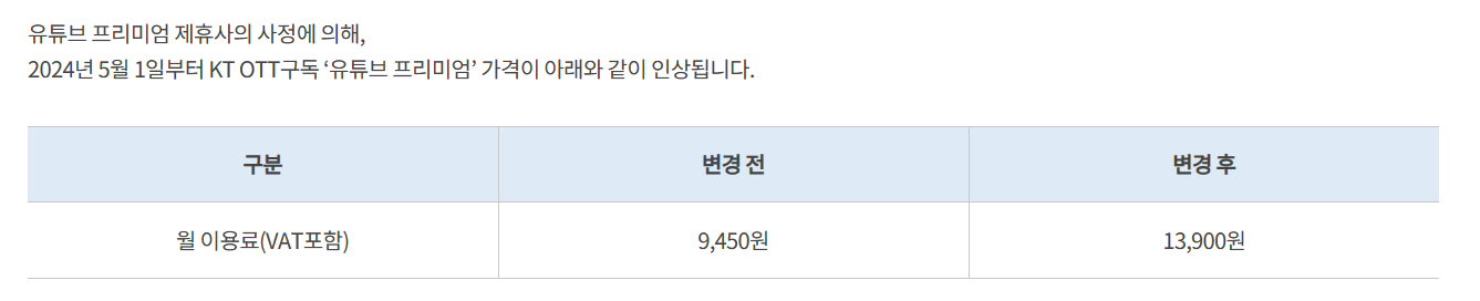 OTT 구독 서비스는 KT 사용자만 사용할 수 있으며, 5/1일 부로 단가가 변동 될 예정입니다.