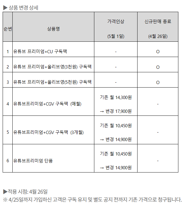 질문1 유독으로 유튜브프리미엄을 4/25일 이전에 가입하면 다음 구독시 인상된 가격으로 결제 되나요?