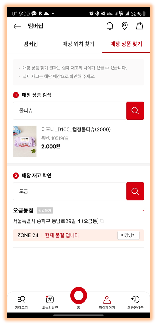 매장위치 옆 매장 상품찾기 탭이 아래의 그림과 같이 있습니다. 탭을 클릭하고 검색창에 원하는 제품 이름이나 키워드를 입력하세요. 다양한 품목 리스트가 나오며, 구매하기 원하는 상품을 선택하고 클릭합니다.