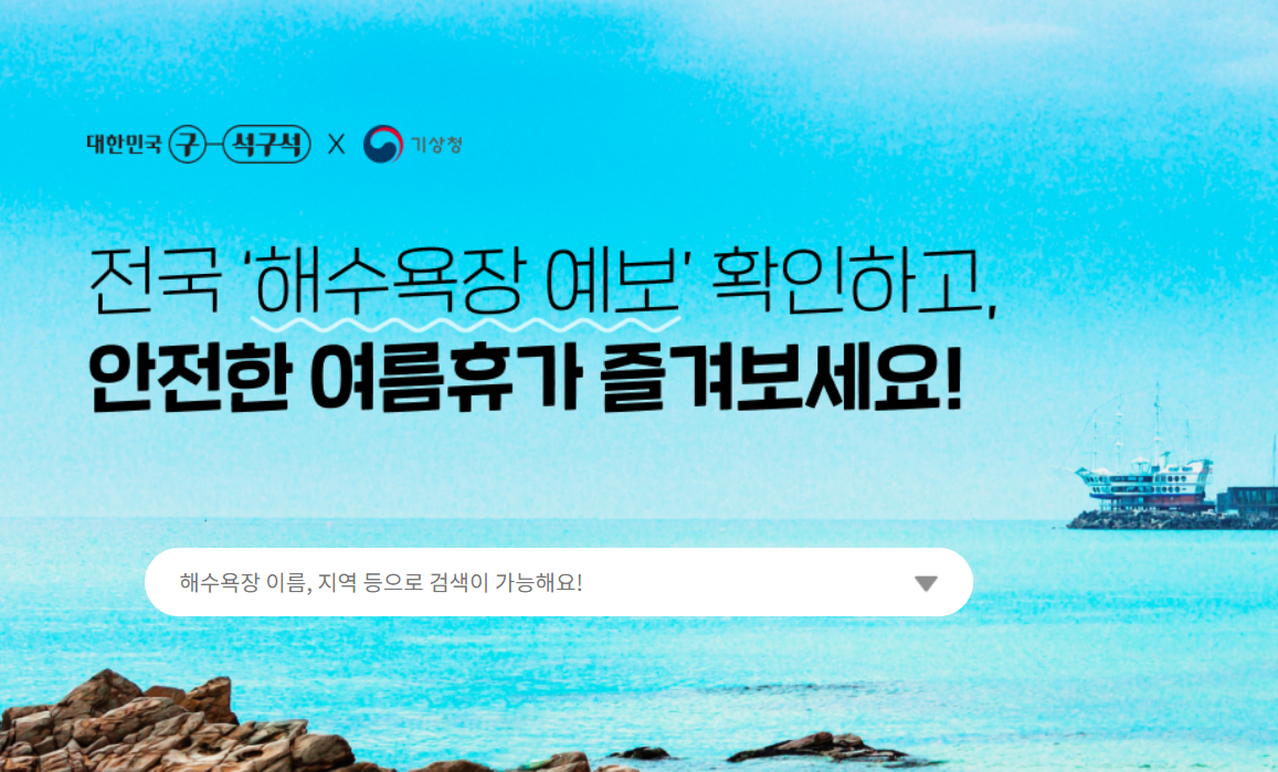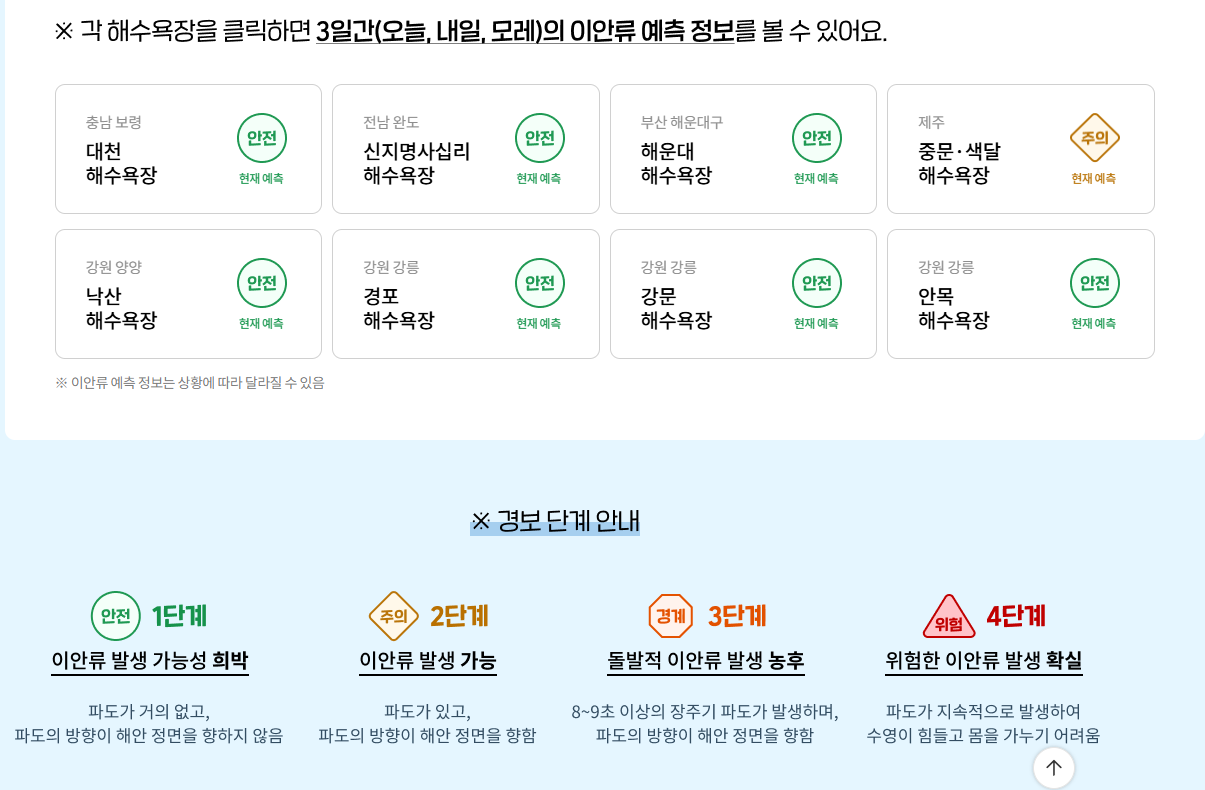 온갖 원망 다 듣고 해수욕장 방문하기 전에 꼭 한번씩 들리는 사이트가 있습니다. 해수욕장 개장정보, 날씨예보, 이안류 정보 를 한눈에 볼 수 있는 곳입니다.