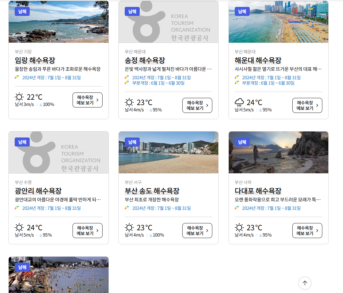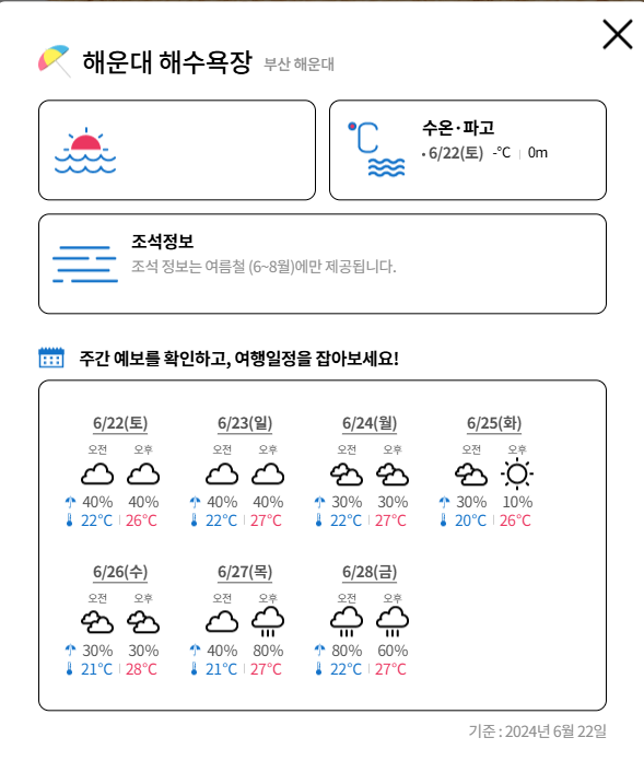 아래의 사진과 같이 부산 지역 해수욕장과 개장일정 현재 날씨와 예보 보기를 확인할 수 있습니다.