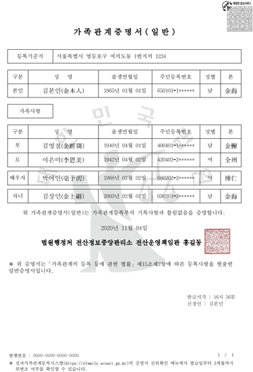 | 일반 | 본인과 부모, 배우자, 생존한 현재의 혼인 중의 자녀에 관한 사항 | ![]() |