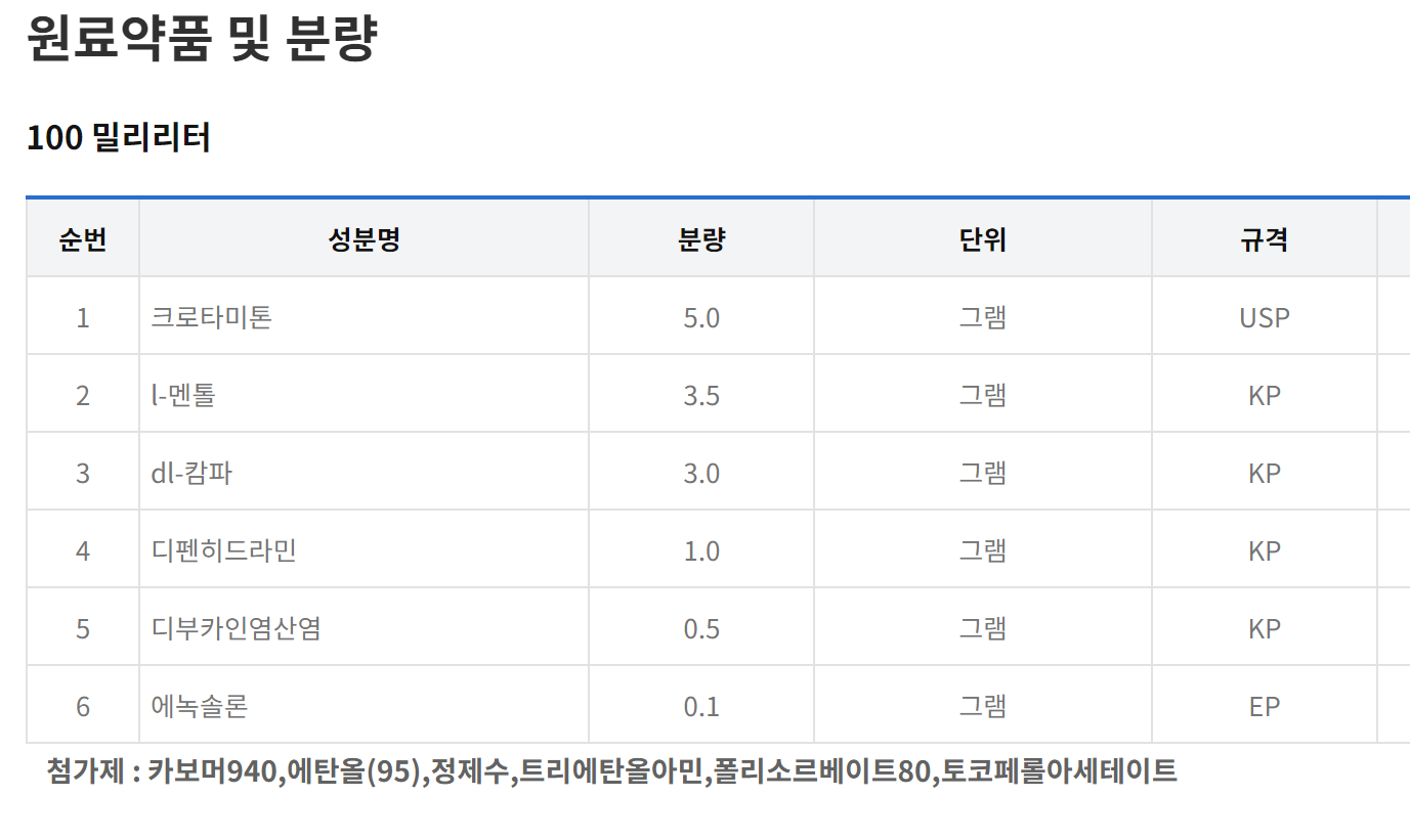 주요 성분으로는 크로타미톤, 디부카인염산염, 디펜히드라민, dl-캄파, 에녹솔론, L-멘톨 등이 함유되어 있습니다.
