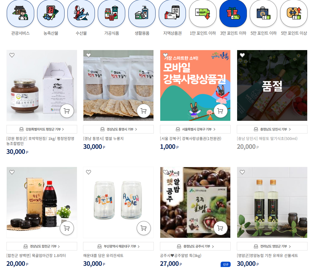 아래는 현재 게시중인 답례품 중 3만 포인트 이하로 조회한 것입니다.