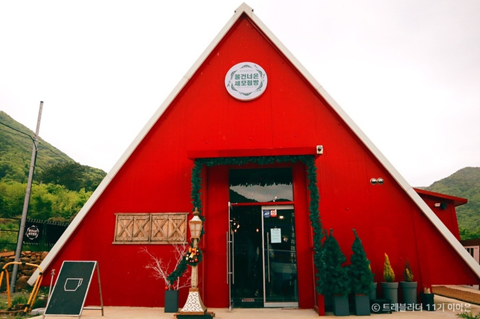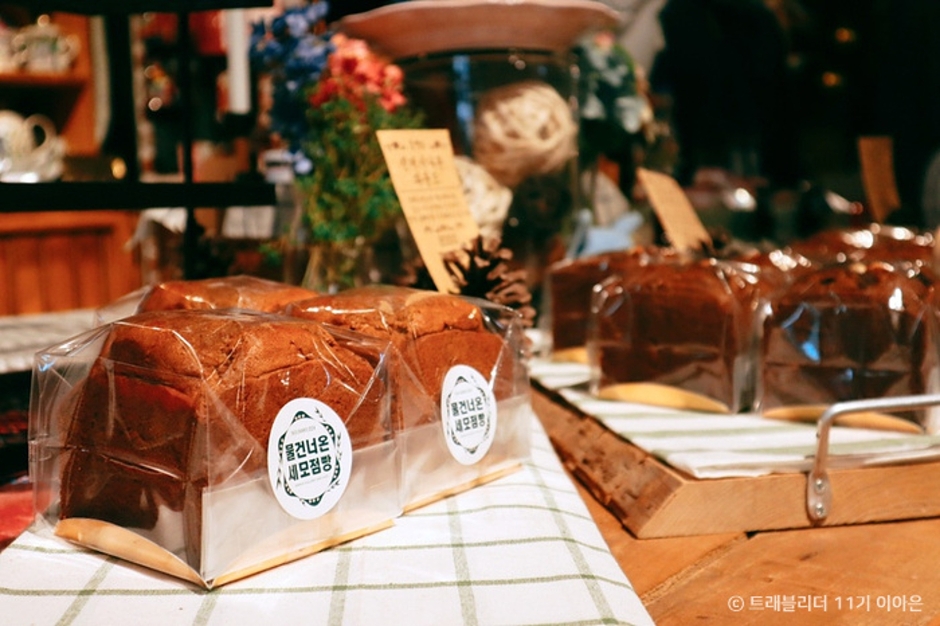 물 건너 온 세모점빵은 1년 내내 크리스마스 분위기를 느낄 수 있는 카페입니다. 점빵은 사투리로 조그마한 상점을 말하며, 가게 이름대로 세모모양의 외관을 가진 빵집입니다. 안에 들어서면 화사하고 반짝이는 크리스마스 용품들이 가득합니다. 가게 한 편에는 간식으로 먹을만한 캔디류도 판매하고 있습니다. 주요 메뉴는 파운드케이크, 밀크티, 뱅쇼, 샹그리아, 바크 초콜릿 등입니다. 파운드케익은 영국 전통방식으로 여섯 종류의 케이크가 매일 새벽 구워져 나오는데, 메뉴판 옆의 유형별 선호도를 보고 골라 드시면 됩니다. 밀크티 역시 첨가제와 물 없이, 우유와 블렌딩 홍차만으로 만들어집니다.